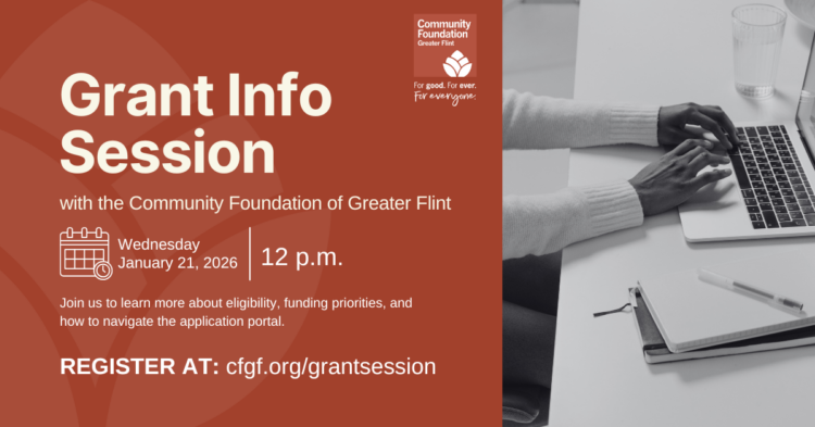 The Grant Information Session will be recorded and presentation slides will be made available for review on our website. We look forward to seeing you on January 21st! If you have any questions, please reach out to us at grants@cfgf.org or by phone at 810.767.8270. Register here.